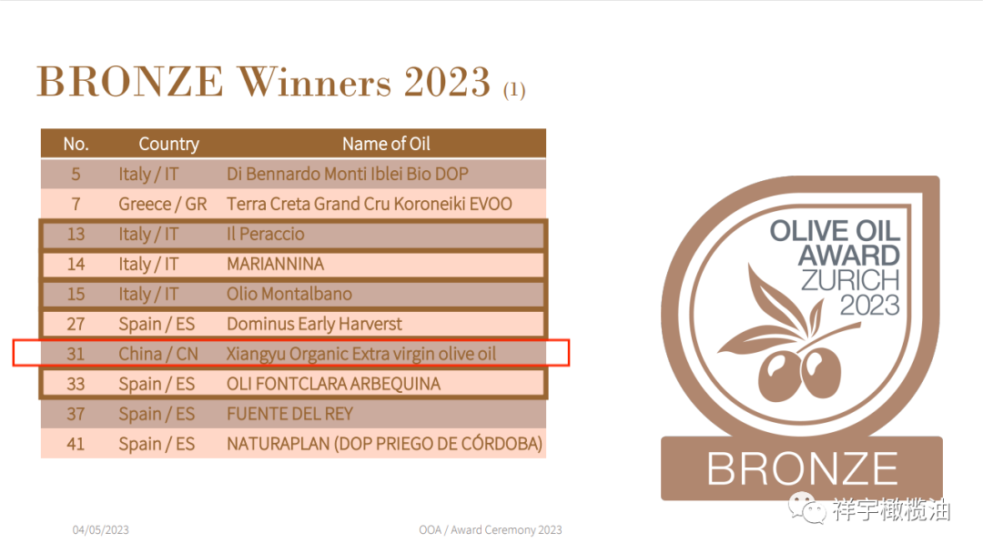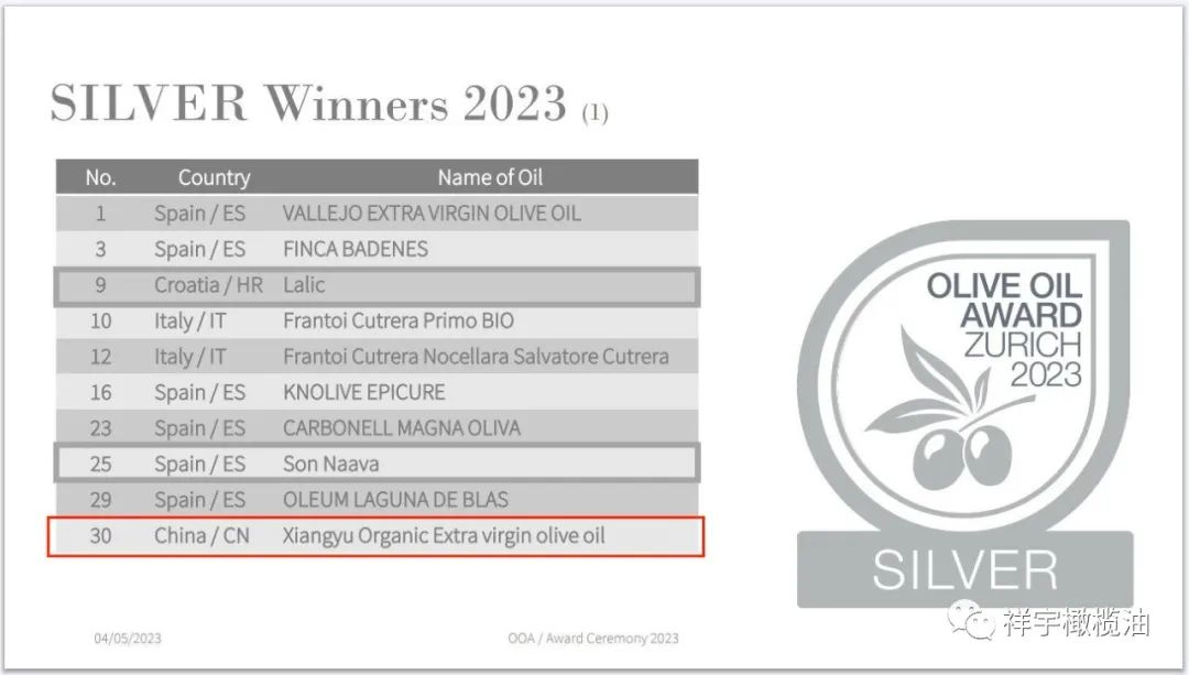 祥宇選送的特級(jí)初榨橄欖油在10個(gè)國家126個(gè)樣品中獲得1銀1銅的好成績。